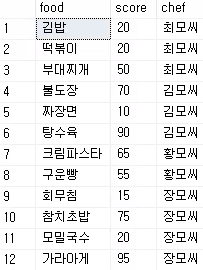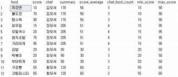 sum, avg, count.. 등 집계함수의 기능은 기존에 쓰는 기능이랑 동일하며 partition by로 chef를 묶은 다음 그 항목에 대해 집계함수를 처리합니다.